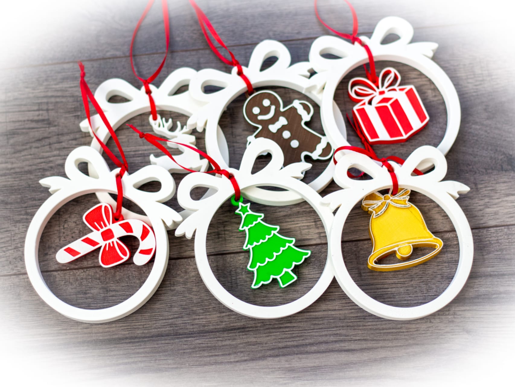 Design Unic: Setul include șase modele clasice de Crăciun, încapsulate într-o ramă circulară albă: