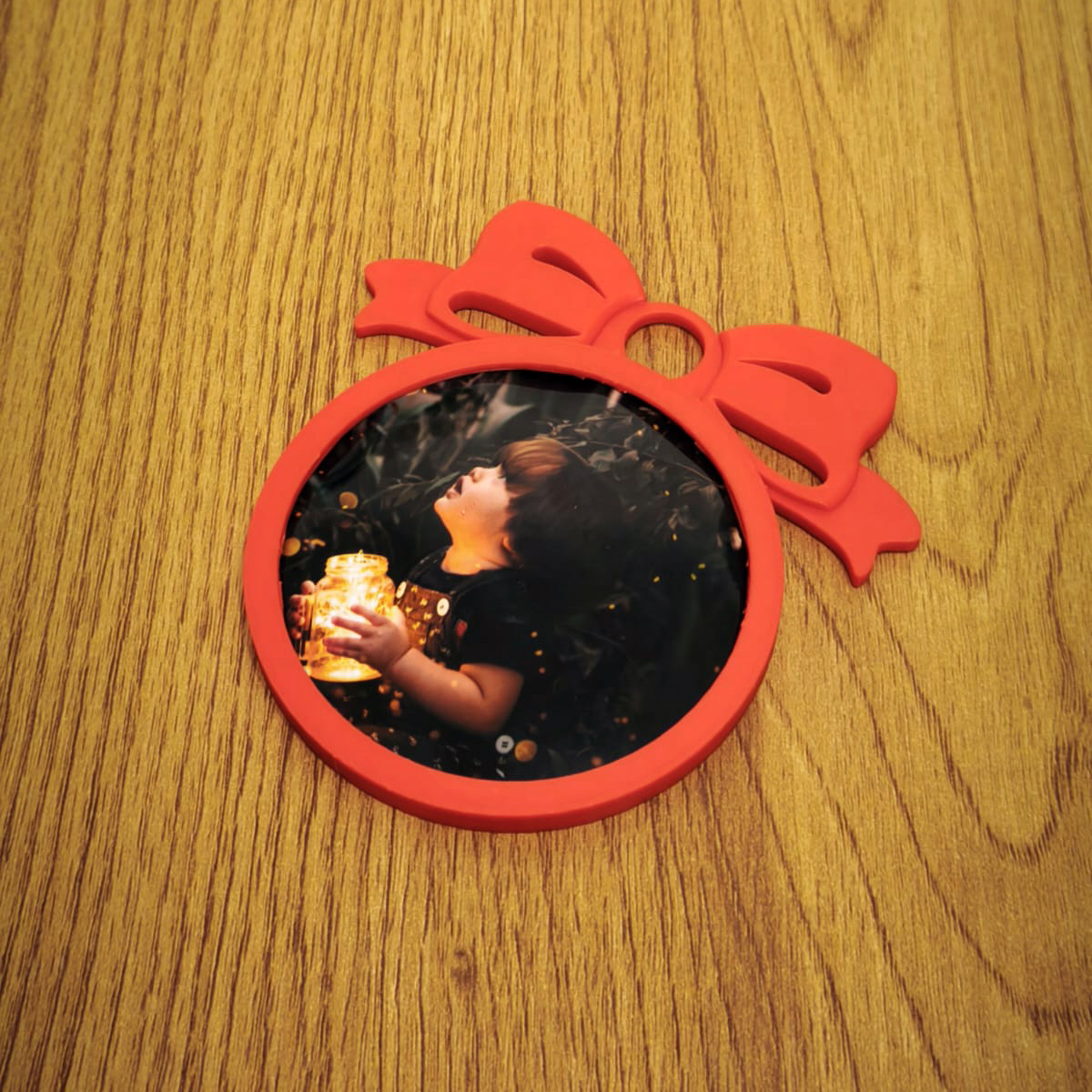 Acest glob clasic, dar personalizat, aduce un plus de culoare și emoție bradului tău. Rama circulară roșie, completată de o fundă festivă, încadrează perfect fotografia aleasă de tine, transformând-o într-un ornament de Crăciun de neprețuit.